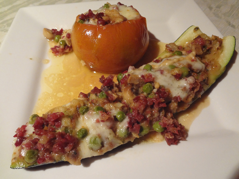 Tambien te ofrezco otra variedad super rica... mis tomates y calabacin rellenos de jamon iberico 100% puro de bellota y una perfecta combinación de vegetales diversos, horneados tambien con queso fundido, detalle2.